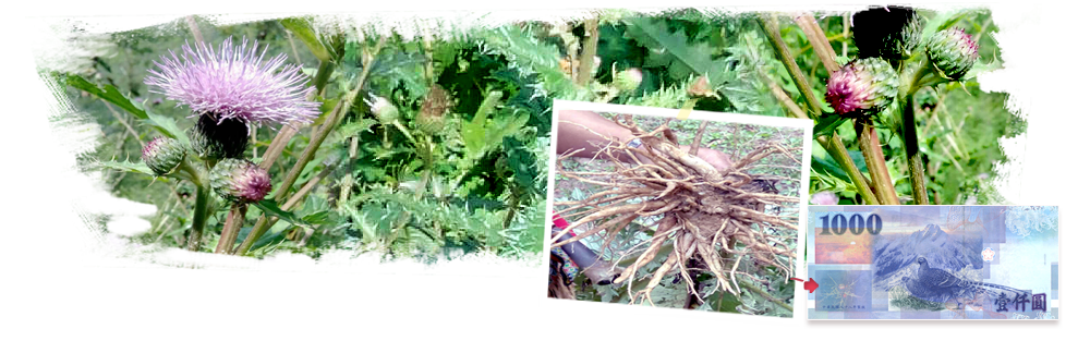 阿里山薊是台灣特有植物,俗稱雞角刺,無法人工培育,只生長在海拔2300~3500公尺範圍,終年冷峻酷寒的環境下成長茁壯,中央銀行用它來砥礪台灣人民,刻苦耐勞,堅忍不拔的精神,因此將它刻畫在新台幣一千元之左下角,也就是真正的台灣國寶植物上方照片為玉山薊與阿里山薊及一千元圖騰之對照。